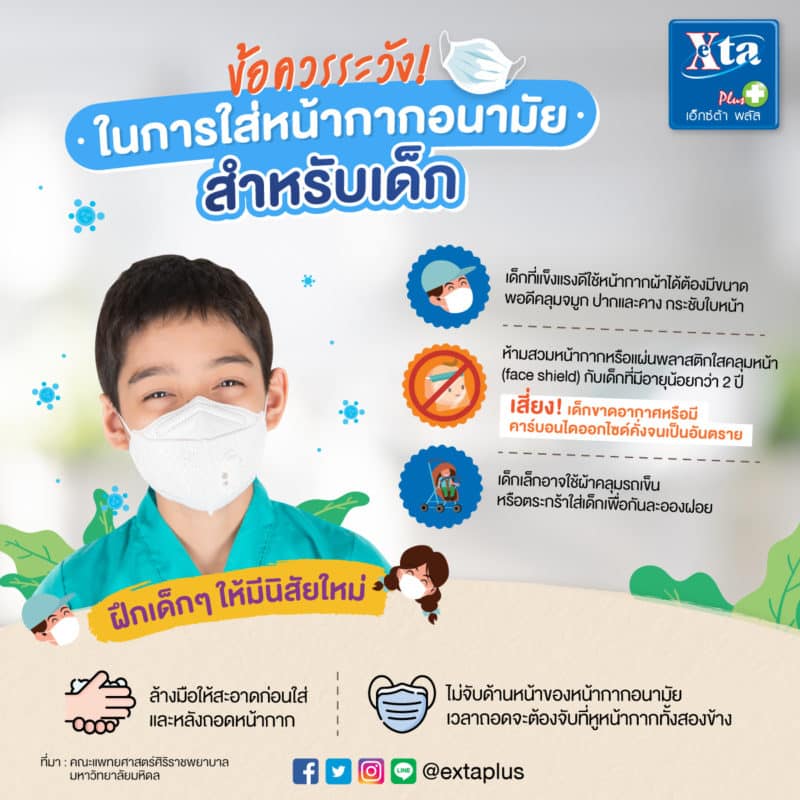 เด็กที่แข็งแรงดีใช้หน้ากากผ้าได้ ต้องมีขนาดพอดีคลุมจมูก ปากและคาง กระชับใบหน้า โดยห้ามสวมหน้ากากหรือแผ่นพลาสติกใสคลุมหน้า Face Shield) กับเด็กที่มีอายุน้อยกว่า 2 ปี