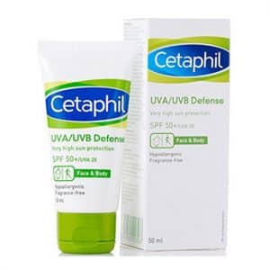 - Cetaphil UVA/UVB Defense SPF 50 ครีมกันแดดสำหรับทาผิวหน้าและผิวกายแบบสูตร 7 in 1 ทาแล้วไม่ขาว ไม่มันวาว และไม่มีส่วนผสมของน้ำหอม จึงช่วยลดโอกาสเกิดอาการแพ้และการระคายเคืองต่อผิวหนังได้