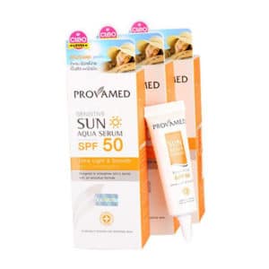 - Provamed Sensitive Aqua Serum SPF 50 ครีมกันแดดที่มีเนื้อครีมบางเบา ช่วยปกป้องผิวจากรังสี UVA และรังสี UVB ช่วยฟื้นฟูและบำรุงให้ผิวมีสุขภาพที่แข็งแรง