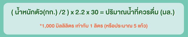 (50/2) x 2.2 x 30 = 1,650 มิลลิลิตร ดังนั้นน้ำที่ควรดื่ม คือ ประมาณ 8 แก้ว ต่อวัน